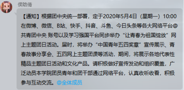 五四青年节之际,为激励广大青年党员时刻牢记习近平总书记嘱托,继承和发扬五四精神,best365英国体育在线本科生党支部于2020年5月4日通过观看网上直播的形式开展“让青春为祖国绽放”线上主题党日活动。