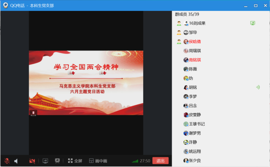 2020年6月6日晚上19时,best365英国体育在线本科生党支部通过QQ群语音会议的形式开展线上主题党日活动,活动主题为学习贯彻全国两会精神。支部全体党员参加活动,公司党委副书记王雄、组织员邹浩列席,主题党日活动由本科生党支部组织委员刘成果主持。