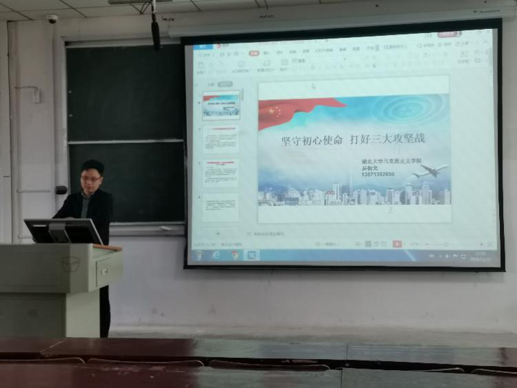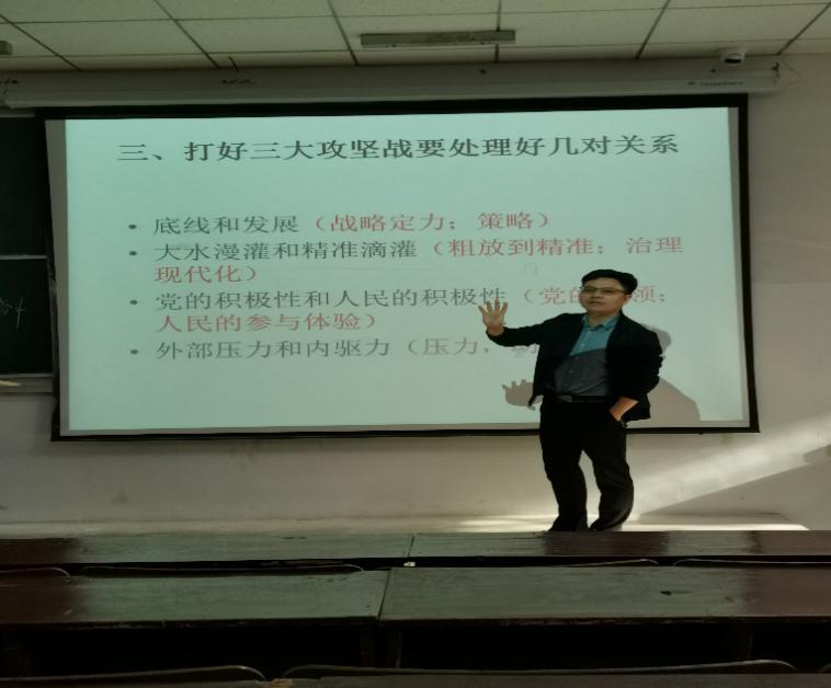 11月11日下午2点,best365英国体育在线马克思主义学院副教授易振龙老师在3号教学楼210课室对马院思想政治教育17、18、19级全体员工开展了《坚守初心报告,打好三大攻坚战》的主题报告。易老师通过“重大风险”、“精准扶贫”、“污染防治”三个方面向同学们讲授三大攻坚战的深刻内容及其重大意义。
