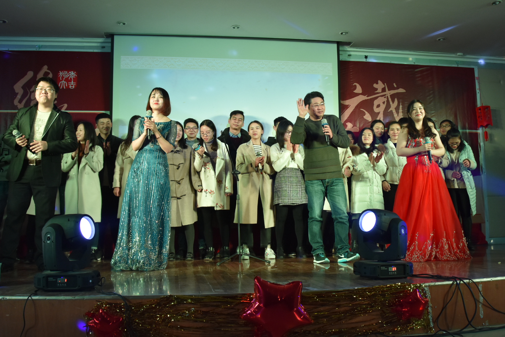 公司团学联主席团用一个创意十足的串烧舞蹈活力开场。随后,一首《一人饮酒醉》点燃全场,充分调动了观众的热情。小品《相亲》、相声《名著歪读》、三句半《欢喜冤家》让现场爆发了一次又一次的笑声与掌声。一首八国语言版的《追光者》更是吸引了大家的眼球,这个节目的表演者为16级思想政治教育专业的一个女生寝室,她们在舞台上一起牵着手歌唱的样子充分展现了老员工的青春活力和浓厚友谊。