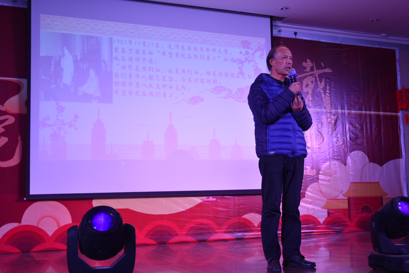 公司的元旦晚会一直秉持着“马院一家人”的理念,真正做到了师生大联欢,老师们也为大家带来了很多精彩的节目。郭劲松老师作为神秘嘉宾上台献唱了《贝尔加湖畔》,唱歌之前他还笑着说:“每年都请我来当神秘嘉宾,我都神秘好几年了。”汤书记也为同学们带来了一首《等你等了这么久》,并说:“不管多少年,你们以后在哪里,我都在马院等你们。”被大家亲切的称为“贺爷爷”的贺祥林老师用湖南话模仿了毛主席的演讲“希望寄托在你们身上”,并为大家献唱了几句,向同学们表达了自己的殷切期望。一首慷慨激昂的师生合诵《我的中国梦》点燃的观众们心中浓浓的爱国之情。最后,晚会在马院硕士研究生以及郭劲松老师合唱的《难忘今宵》中落下帷幕。