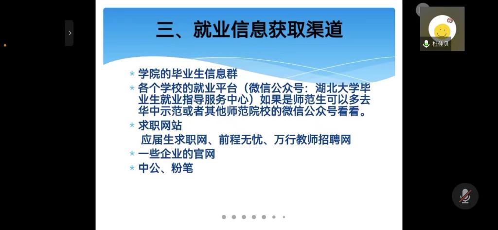 随后,杜佳贝同学结合同学们即将步入大三的现实需求,系统地讲述了入职教师岗位的相关内容以及一些入职过程中的注意事项,涵盖了自我定位、公司招聘方式、就业信息获取渠道、就业准备四个方面。两位学姐在分享结束后都鼓励19级同学们在努力学习专业知识、准备考研的同时也要注重就业规划,勉励大家在未来不断寻求进步。