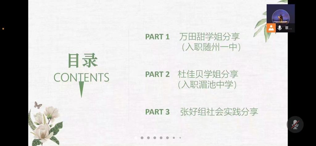 万田甜和杜佳贝学姐分享结束后,2019级思政专业张好同学也就自身暑期社会实践谈及新课改教师岗位的现状,结合自身情况就专业学习和新高考之下对教师要求的变化等话题进行了讨论。