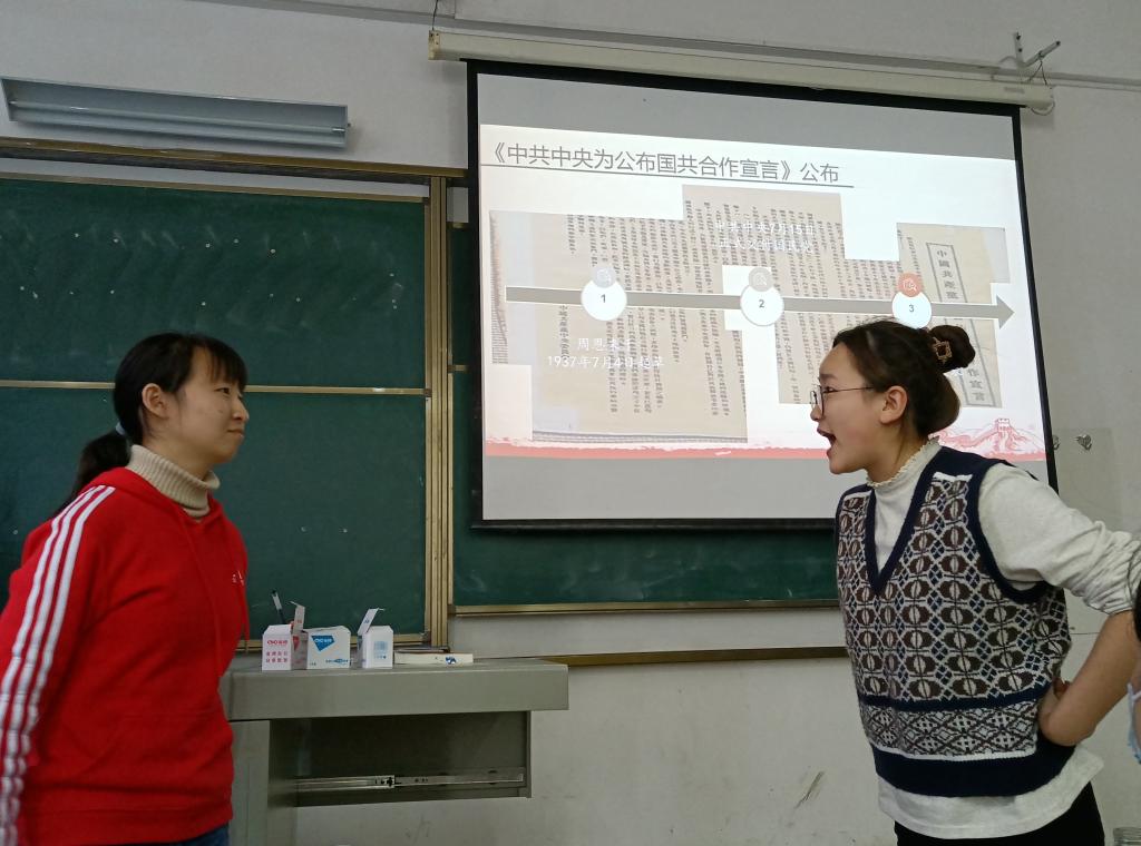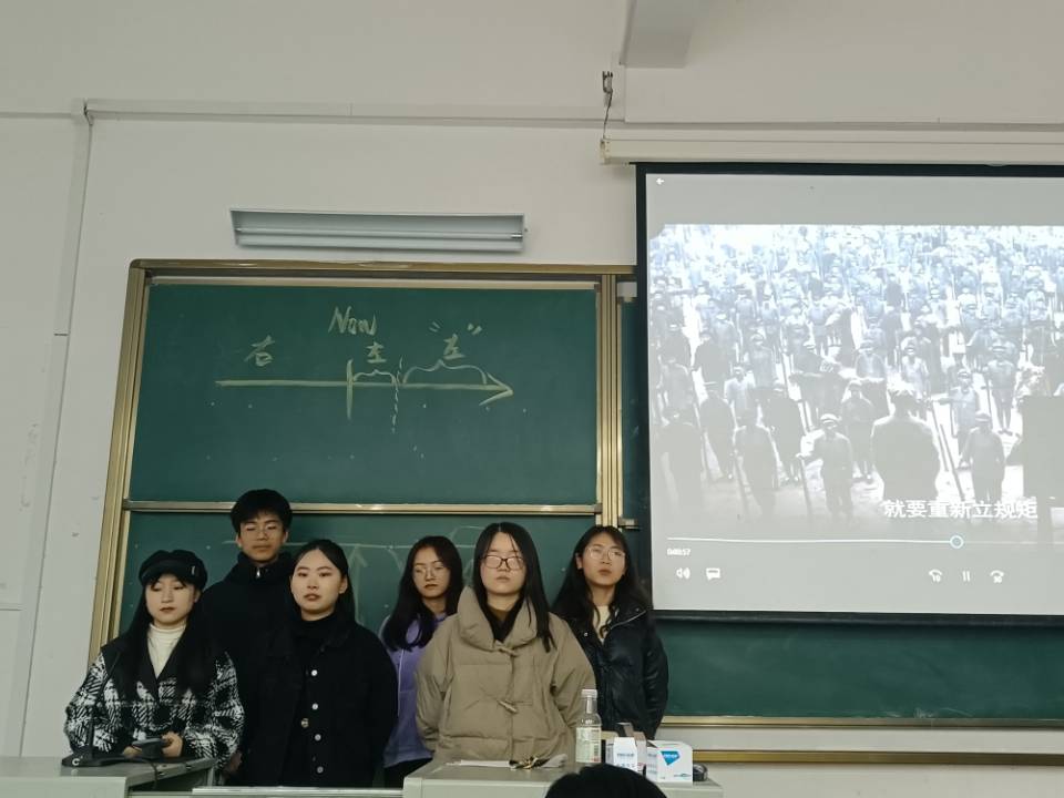 目前小组展示已进行到第五组,同学们各展所长,在思政课堂玩出了新花样,师生在一片欢声笑语中“学史明理”。21级赵倩、郑瑶瑶、严艺等同学或自主制作微电影展示土地革命时期的思想政治教育,或情景扮演胡适和李大钊还原“问题”与“主义”的论辩、或化身抗战时期的热血青年展现一个平凡人的思想转变历程。“在这次自主学习中,我和组员通力合作,提升了我的团结协作能力,并在搜集资料的同时,了解到一些课本之外的知识,更加深化了我对这门课程的理解。”第二组员工付方宇说。