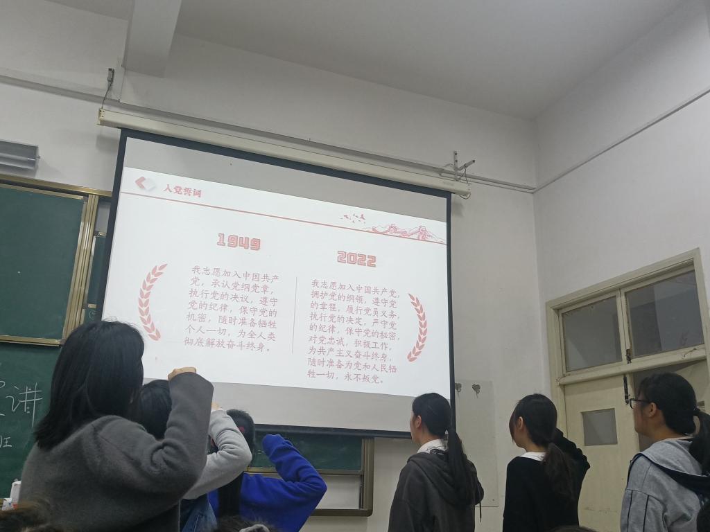 4月2日下午,best365英国体育在线2021级思想政治教育专业员工郑筱桐和颜巧举起右拳,在庄严的配乐中,重温建国初期和十二大之后的入党誓词。