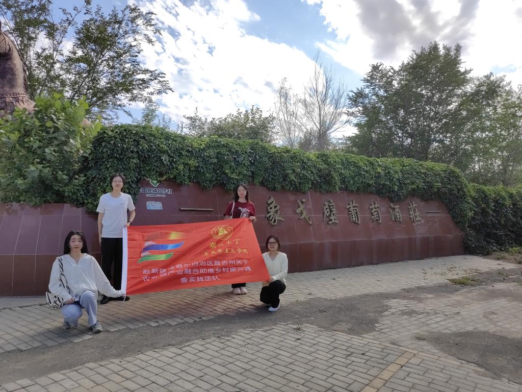 实践团队成员王祎莼、胡蓉、谭铭宇、贾惠媛四人首先前往昌吉市榆树沟镇勇进村的一韵庄园,参观葡萄酒窖、深入了解葡萄酒的制作过程、品尝特色葡萄酒。在与管理人员的交谈中了解一韵酒庄的发展历程、生产模式和融葡萄种植、葡萄酒生产和餐饮于一体的发展模式;在体验中国酒文化、民宿文化和新疆餐饮文化的过程中,总结葡萄酒产业融合的发展经验。实践团队还前往昌吉市三工镇二工村参观当地的印象戈壁酒庄。管理人员提到该酒庄的多元运作模式将农户连接到产业链条中,带领二工村200多名村民增收致富,拉动了经济增长,促进乡村振兴。