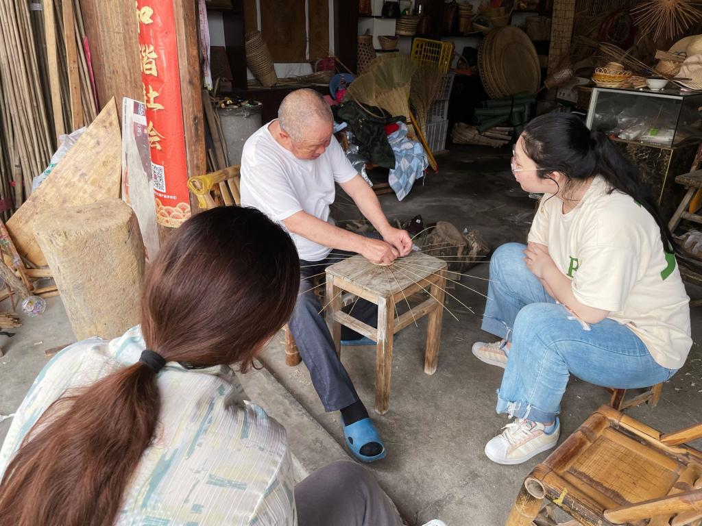 (图为调研团队向非遗传承人学习非遗竹编制作)