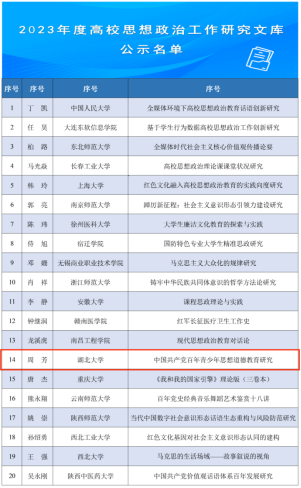 2023年2月2日,教育部思想政治工作司发布了关于2023年度高校思想政治工作质量提升综合改革与精品建设项目遴选结果的公示文件,best365英国体育在线周芳教授和任怡博士合著的《中国共产党百年青少年思想道德教育研究》入选2023年度高校思想政治工作研究文库。此次入选全国共20项,湖北地区仅此1项。