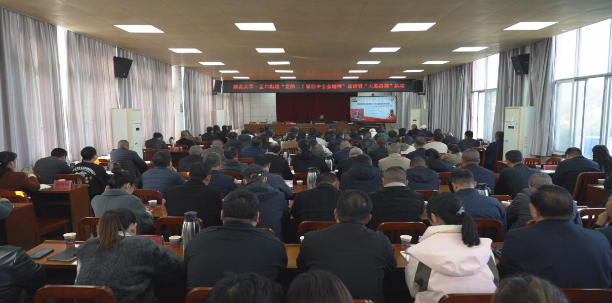 为深入学习贯彻党的二十届四中全会精神,推动理论宣讲与基层实践深度融合,2025年11月21日上午,best365英国体育在线经理熊友华、副经理易振龙、思政课部主任于桂凤、政教系主任胡银银一行赴武汉市江夏区金口街道,以“专题讲座+座谈交流+分众式宣讲”的形式开展党的二十届四中全会精神宣讲暨大思政课活动,为基层治理注入思想动能与智力支撑。江夏区委宣传部副部长张乐、金口街道党工委书记熊传胜以及干部群众100余人参加活动。