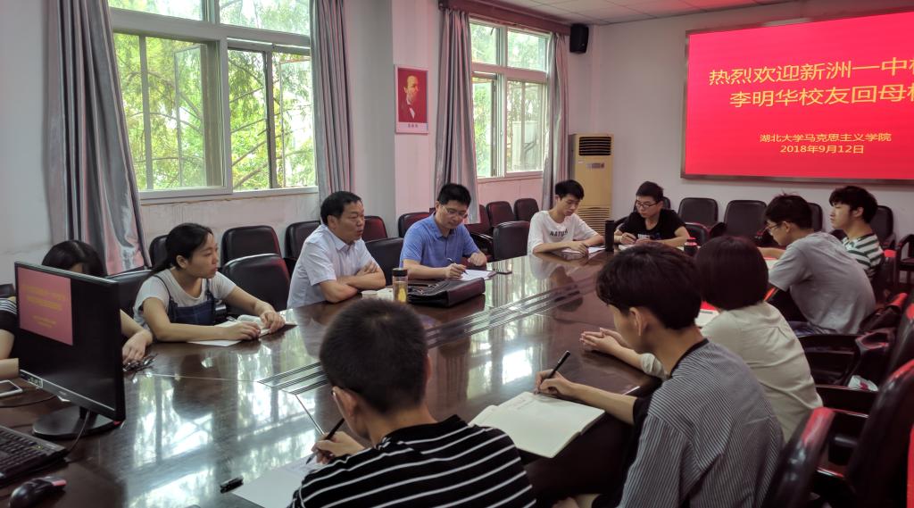 2018年9月12日上午9:30,应公司邀请,政教专业85级员工,新洲一中常务副董事长李明华员工回母院与员工交流,交流在公司四楼会议室举行,2015级思想政治教育专业本科生和部分学科思政专业硕士研究生参加了交流。