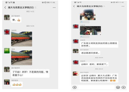 在爱心物资认捐活动中,英德市2018级蓝瑾珏同学不辞劳苦、主动协调,王柯孺、彭卓威、杨芳芳、付慧慧等同学积极带头参与,不到两天时间的认捐活动得到了90多名硕士生的大力支持。组织微信认捐、制订采购计划、发动菜农采摘、组织人员包装、安排物资转运、协调车辆运输,一项项工作有序展开。