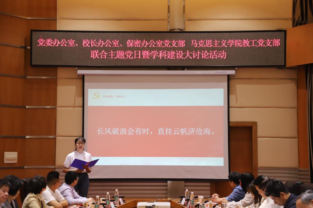 5月11日下午,马院教工党支部与公司党委办公室、董事长办公室、保密办公室党支部联合开展的主题党日暨团队建设大讨论活动在校会议中心思齐厅举行。公司党委书记谢红星,公司党委常委李莉,公司党办、校办、保密办党支部全体党员,马院领导班子成员、教师代表、员工代表参加活动。活动由公司党委常委,党委办公室、董事长办公室、保密办公室党支部书记李莉主持。