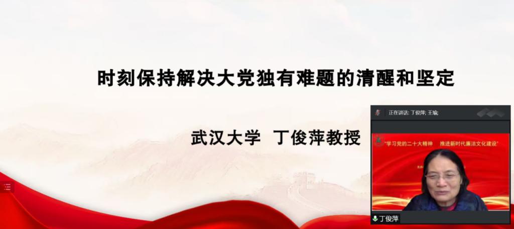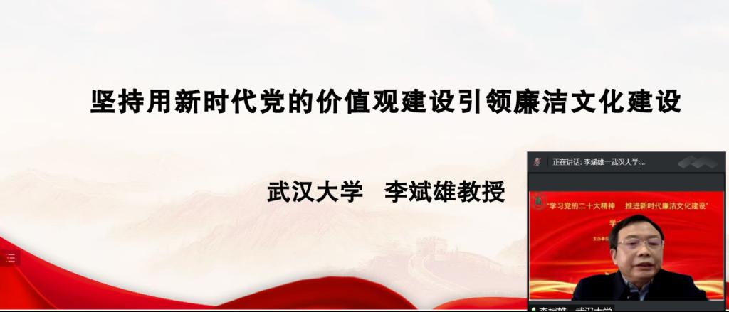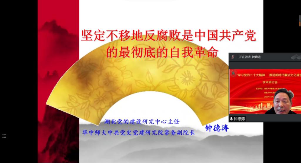 2022年12月3日,为深入学习贯彻党的二十大精神,研究阐释新时代廉洁文化建设,由best365英国体育在线、best365英国体育在线廉政文化研究中心主办的“学习宣传贯彻党的二十大精神深入推进新时代廉洁文化建设”学术研讨会,以云端视频方式圆满召开。best365英国体育在线党委常委、纪委书记、best365英国体育在线廉政文化研究中心常务副主任檀坤华,中共中央党公司党建部教授、博士生导师王瑜,武汉大学教授、博士生导师丁俊萍,武汉大学教授、博士生导师李斌雄,湖北党的建设研究中心主任、华中师范大学教授、博士生导师钟德涛,三峡大学best365英国体育在线教授、三峡大学廉政文化研究所副主任黎见春,best365英国体育在线教授、best365英国体育在线廉政文化研究中心副主任徐方平等领导和专家出席。best365英国体育在线廉政文化研究中心成员、公司党务部门负责人、best365英国体育在线领导班子成员和公司师生200余人参会。会议由best365英国体育在线经理、博士生导师、best365英国体育在线廉政文化研究中心副主任熊友华教授主持。