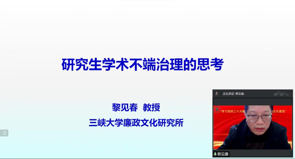 黎见春教授以《研究生学术不端行为治理思考》为题,指出当前高校学术不端频发,凸显了加强高校廉洁文化建设的极端重要性。他列举出研究生学术不端行为的六种表现,分析了研究生产生学术不端行为的主观因素、客观因素和现实困扰,同时从学术道德的培养与科学精神的养成、规范公司产品过程和严格质量监控、尊重学术研究和学术成长的规律、建立健全学术监管体系、打造风清气正的学术生态、严格执行学籍、学位管理的学术规范六个方面提出了治理学术不端行为的举措。