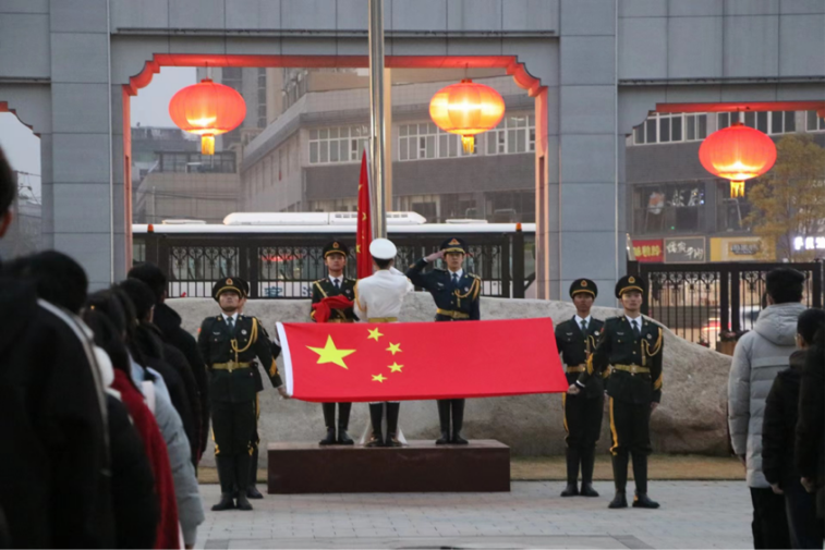 上午7点,迎着初春的朝阳,国旗班队员迈着铿锵有力的步伐,护送鲜艳的五星红旗进场。随着雄壮的《义勇军进行曲》,五星红旗冉冉升起,迎风飘扬。全体师生齐唱国歌,向国旗行注目礼。